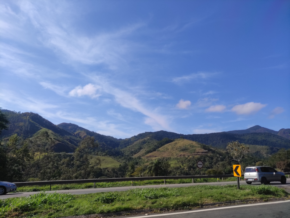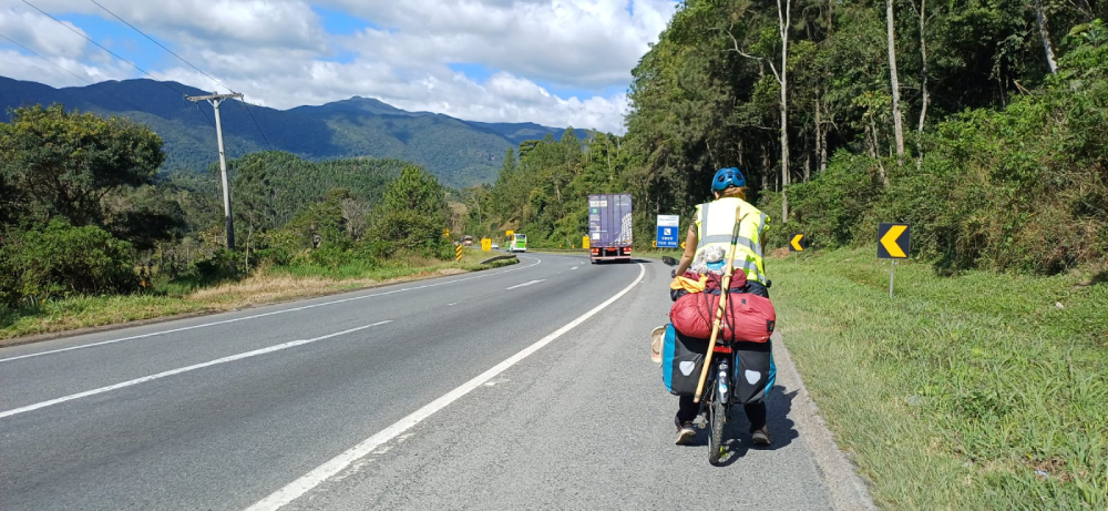 Schließlich führte uns unser Weg auf die stark befahrene SP-BR-116 in Richtung Curitiba. Der dichte Lkw-Verkehr machte die Strecke nervenaufreibend, besonders an den Stellen, an denen der Seitenstreifen plötzlich endete. Wenn die Lastwagen mit geringem Abstand an uns vorbeizogen, stockte uns manchmal der Atem. Selbst auf dem Seitenstreifen zu fahren, war nicht angenehm, denn dort lag jede Menge Müll: von Schrauben und Auspuffteilen über Glasscherben bis hin zu Flaschen. Jeder Kilometer fühlte sich wie ein kleiner Kampf ums Überleben an.