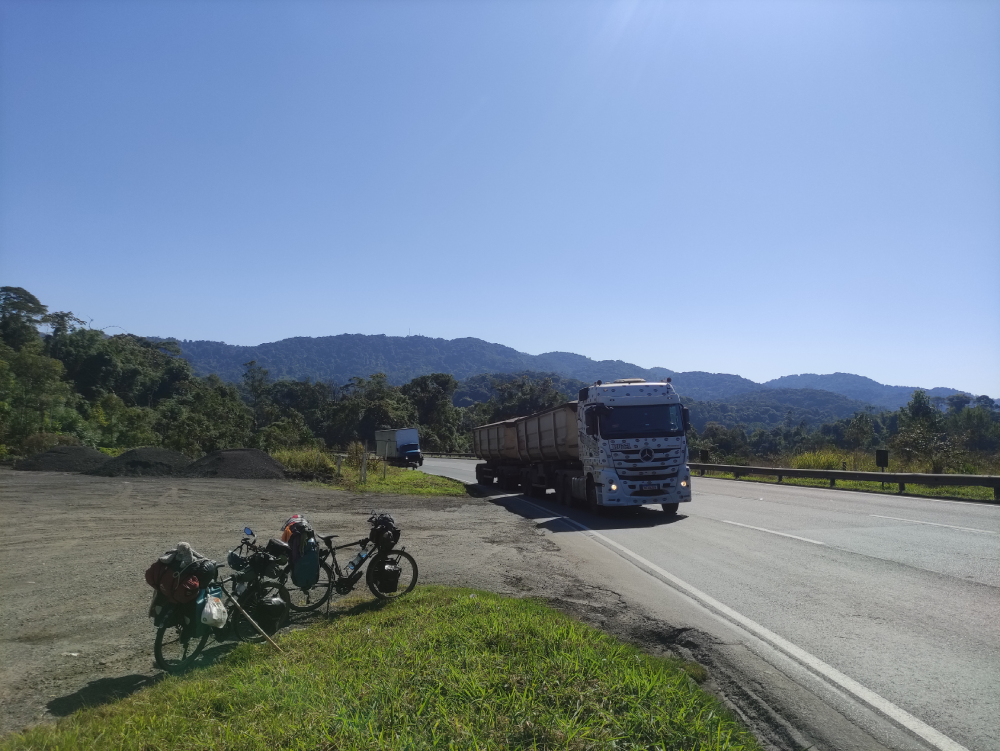 Schließlich führte uns unser Weg auf die stark befahrene SP-BR-116 in Richtung Curitiba. Der dichte Lkw-Verkehr machte die Strecke nervenaufreibend, besonders an den Stellen, an denen der Seitenstreifen plötzlich endete. Wenn die Lastwagen mit geringem Abstand an uns vorbeizogen, stockte uns manchmal der Atem. Selbst auf dem Seitenstreifen zu fahren, war nicht angenehm, denn dort lag jede Menge Müll: von Schrauben und Auspuffteilen über Glasscherben bis hin zu Flaschen. Jeder Kilometer fühlte sich wie ein kleiner Kampf ums Überleben an.